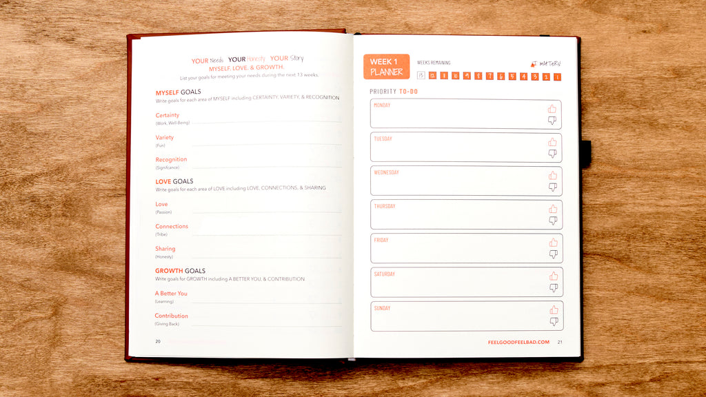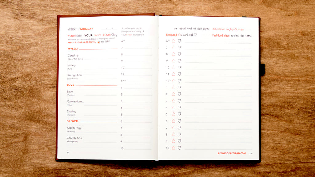 THE FEEL GOOD? FEEL BAD? | Human Needs Blueprint Journal & Planner is based on psychologist Abraham Maslow's hierarchy of human needs as well as Cognitive Behavioral Therapy. CBT is a form of psychological treatment that has been demonstrated to be effective for a range of problems including time and task management, ADHD, depression, anxiety disorders, addiction problems, marital issues, eating disorders, mental illness and more. Through CBT we learn that our thoughts affect our emotions and our emotions affect our behaviors. In other words, in order to overcome our adversities and achieve lasting and enjoyable routines we need to recognize that capable emotional space between our unique needs and our desired behaviors.